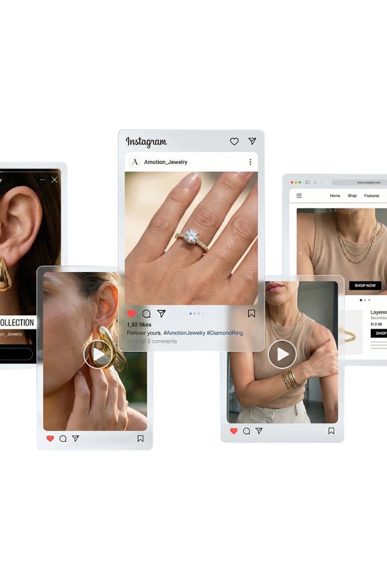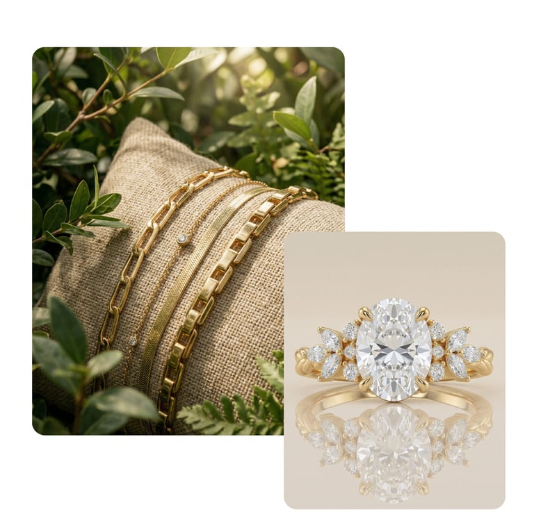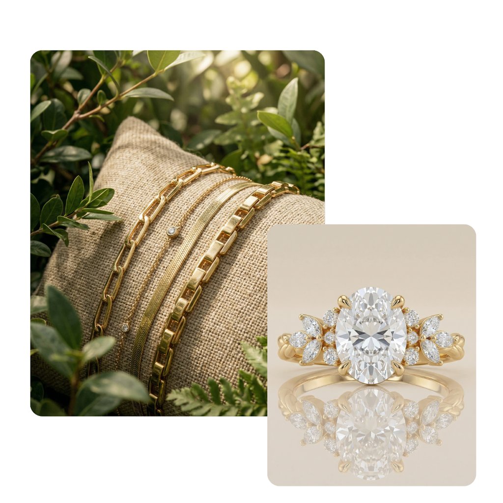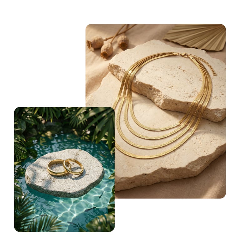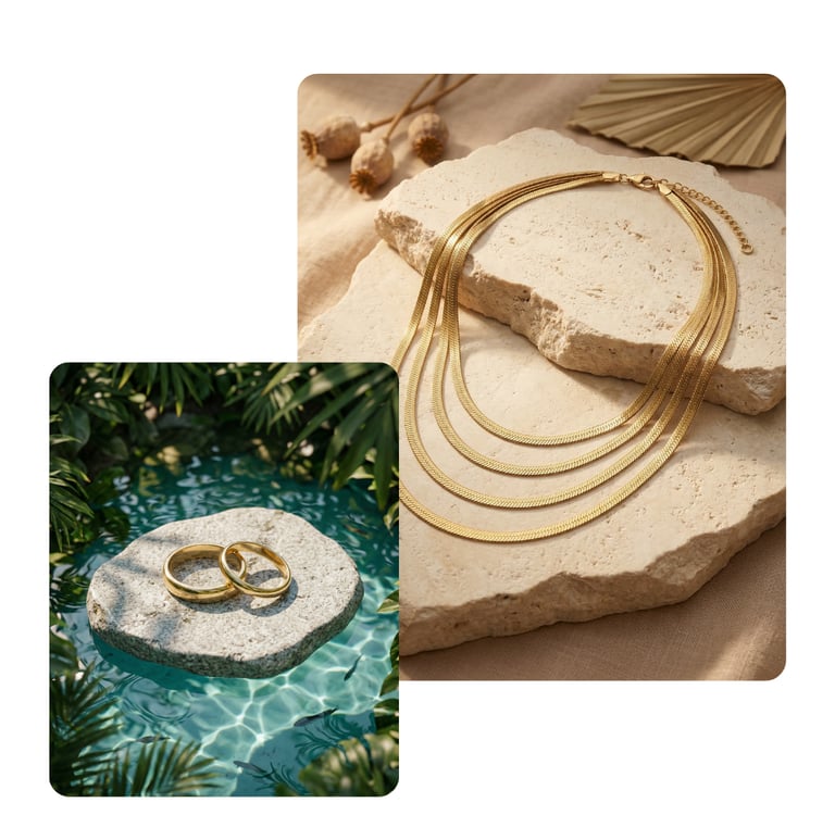 Stilvolle Umgebungen und passende Szenen sorgen für eine natürliche Einbindung des Produkts in den Alltag. Egal ob Stadt oder Natur – Schmuck kann in jeder Umgebung inszeniert werden, unabhängig von Ort und Jahreszeit.