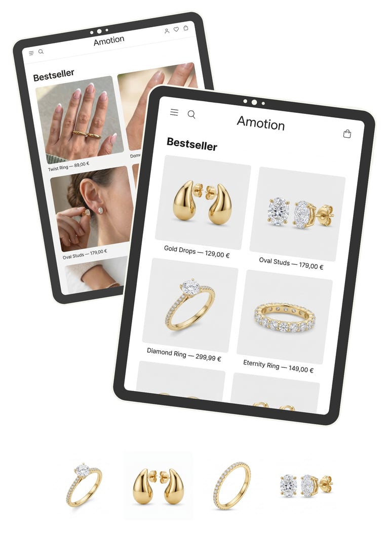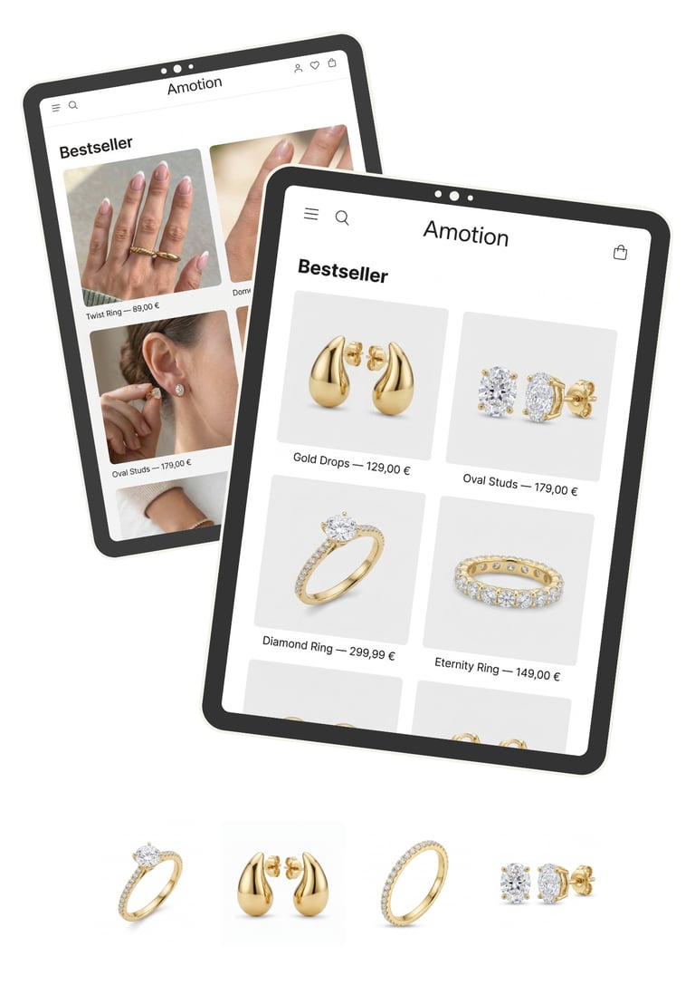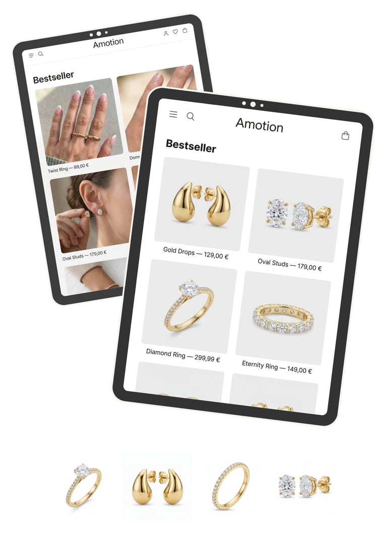 Unsere Produktfotos und Werbevideos lassen sich direkt in Social Media, Werbeanzeigen und Online-Shops einsetzen. Ein Look, der überall funktioniert und deine Marke konsistent präsentiert.