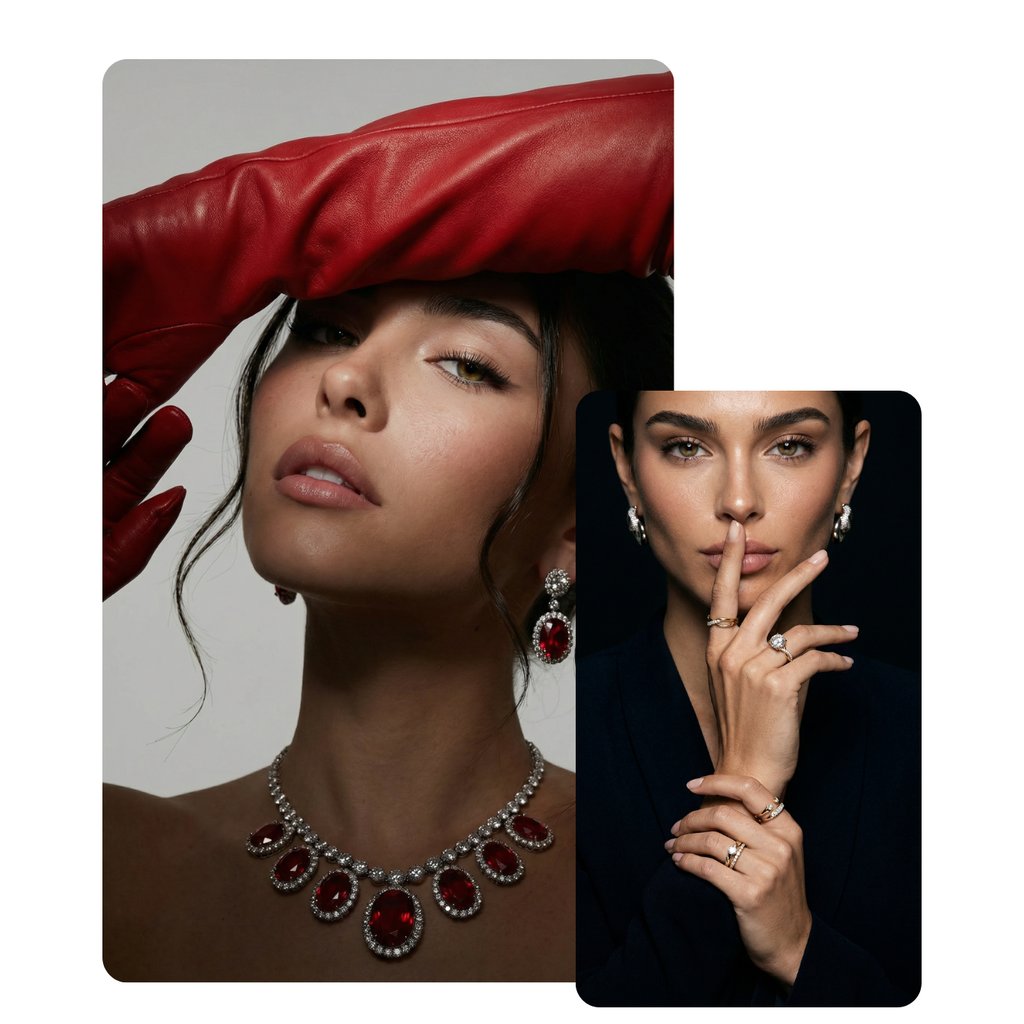 Je nach Produkt und Zielsetzung entstehen reine Produktaufnahmen, Model-Visuals oder bewusst inszenierte Szenen. Durch KI sind wir nicht an reale Locations gebunden und setzen Schmuck- und Uhrenvisuals sowohl in Studio-Setups als auch in außergewöhnlichen Umgebungen um .